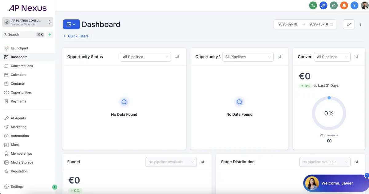 Webs, funnels, CRM, email marketing, automatizaciones, agenda, ventas y soporte. Todo conectado. Todo dentro de AP NEXUS