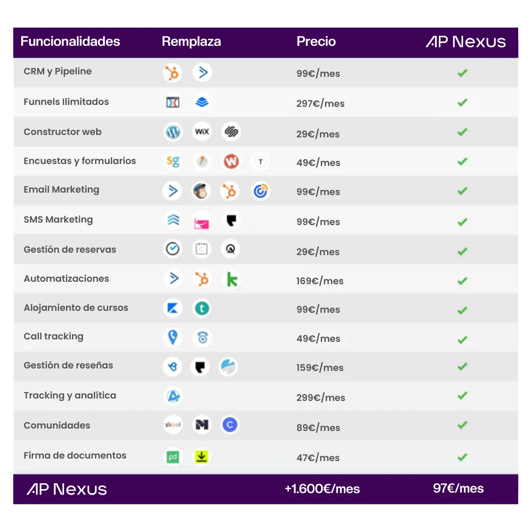 Sí. Con AP NEXUS puedes dejar de pagar por herramientas como ClickFunnels, ActiveCampaign, Calendly, Zapier o Typeform. Todo está integrado dentro de un solo sistema.